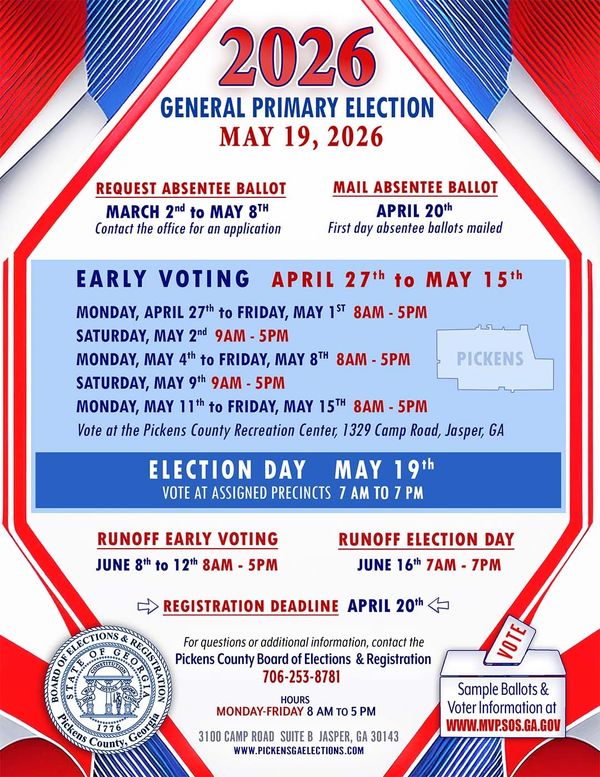 Advance voting for the election shall begin on Monday, April 27, 2026, and continue until Friday, May 15, 2026, including two Saturday voting days May 2 & 9, 2026, at the Pickens County Recreation Department.